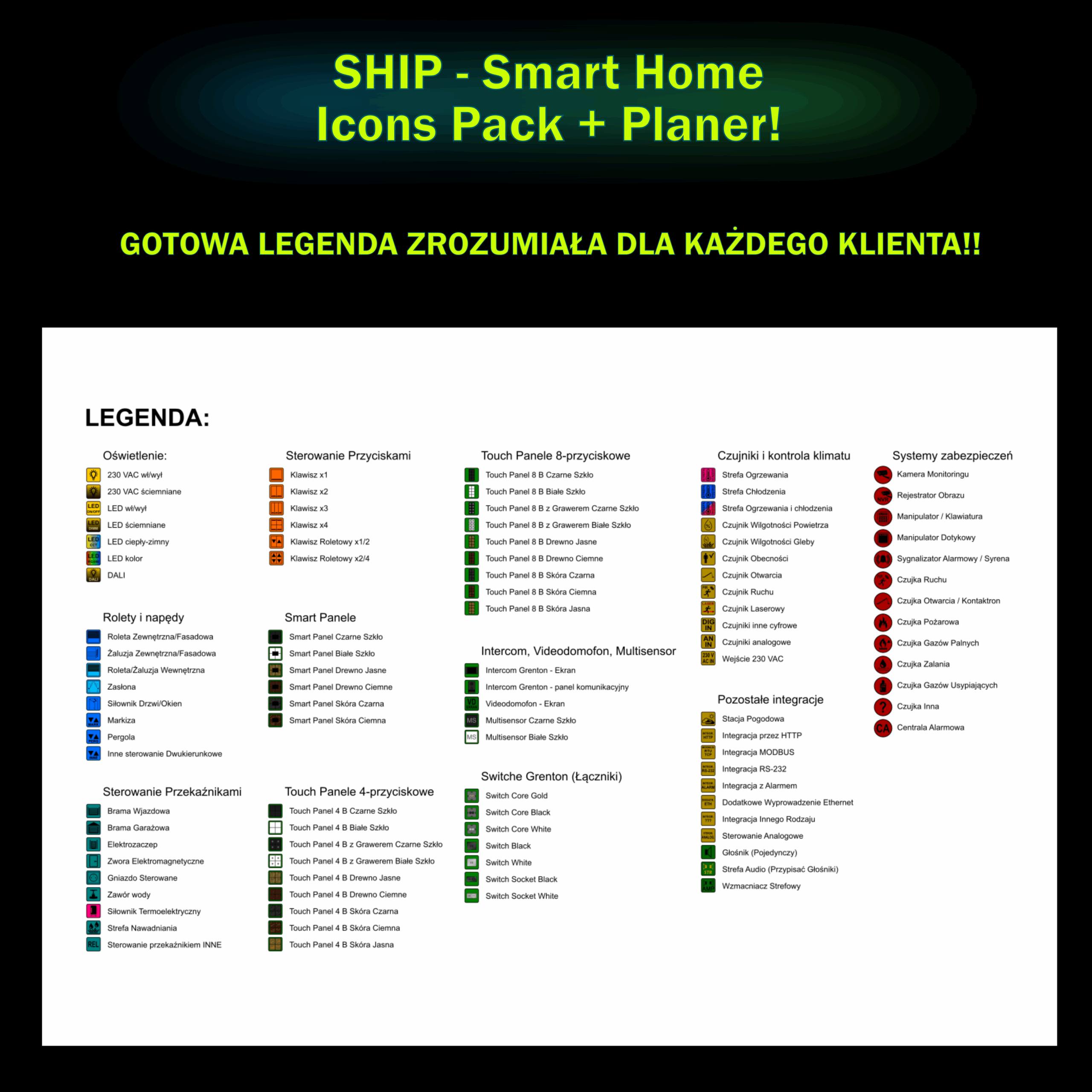 Smart Home Icons Pack to specjalna paczka do planowania instalacji smart home (dedykowana dla Grenton) zawierająca: